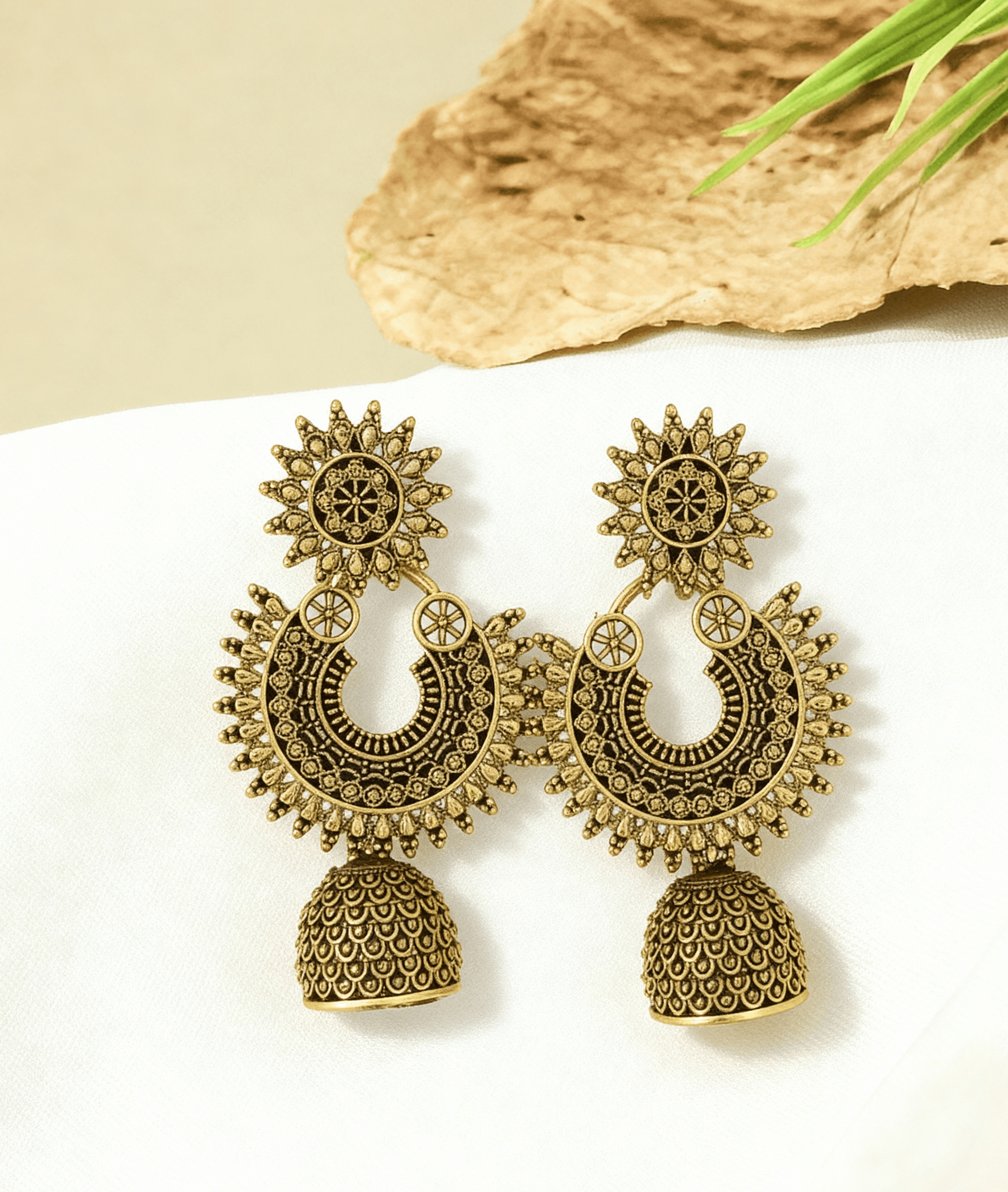 1. Design Elements: These are gold-plated jhumka earrings featuring an intricate sunburst stud top and an ornate crescent-shaped middle section.